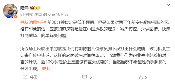 媒体人陆洋评价国足U23的表现:“前30分钟肯定是低于预期,但是如果对两三年前安东尼奥带队的风格有印象的话,应该知道这就是他在中国执教的理念:减少传控、少做回接、快递打到前场、简单解决问题。”