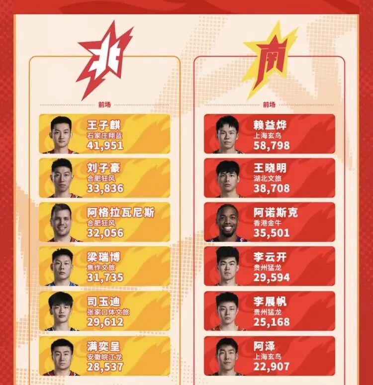 从NBL官方公布的投票统计结果来看,赖益烨以58798票暂列南区第一,比南区排名第二的湖北队长王晓明多了20000多票,比目前北区票王来自石家庄的王子麒的票数足足多了16000多票……